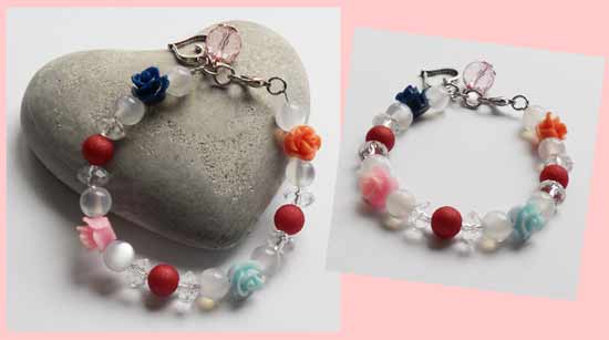 Hier een armbandje gemaakt met de nieuwe mix rijgroosjes. Als je verschillende kralen uit een kleurenmix in één sieraad wil gebruiken, moet je de rest van het ontwerp wat rustiger houden. Daarom is er gekozen voor transparante rondellen en imitatie cateye kralen. Deze imitatie cateye kralen hebben een zachte uitstraling doordat ze semi-transparant zijn en een mooie glans hebben. Het effect wordt veel harder als je echt witte kralen gebruikt. Dat kan natuurlijk ook, maar dan vallen de roosjeskralen wat minder op. Als accent heb ik donkerrode powder kralen gebruikt. Je kan natuurlijk ook kiezen voor een ander kleur die past bij de kleuren van de roosjes.