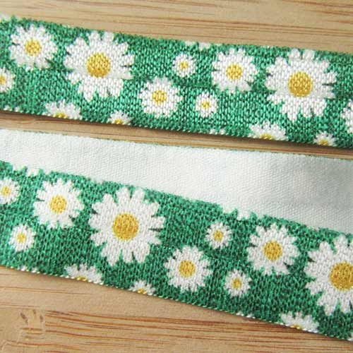 Vrolijk elastisch band met dessin met witte margrietjes op groen band.