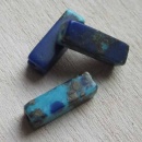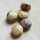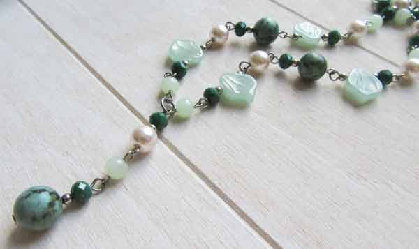 De vaak wat gemêleerde, natuurlijke uitstraling van deze kralen maakt ze ook erg geschikt om 'gewone' sieraden, met bijvoorbeeld glaskralen, te verrijken. Zoals in de ketting hierboven: een enkele turquoise kraal haalt de bleke groentinten in dit ontwerp helemaal op.