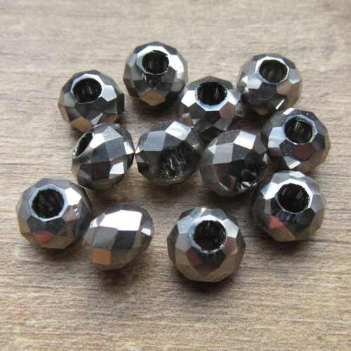 Past net over leerkoord. De kraal heeft een schitterend effect door de facetten en de glanzende antraciet-zilverkleurige coating.