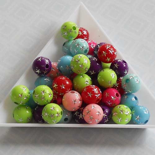 Mix met ronde kralen met zilverkleurige sterretjes erop. In de kleuren als op de foto.