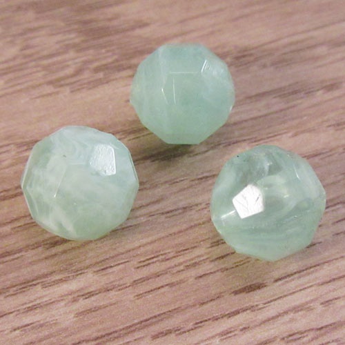 Zachtgroene kraal, hier en daar iets transparant. De kraal is gemêleerd groen met een vleugje wit en oogt dan ook als natuursteen.