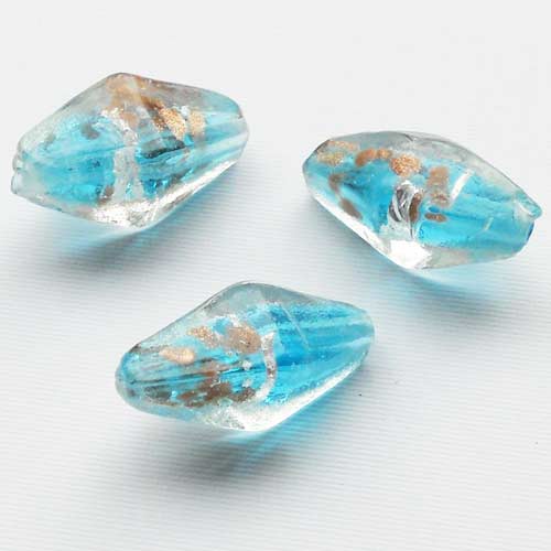 Transparante bicone met aquablauwe kern gedecoreerd met zilverfolie en goudpoeder.