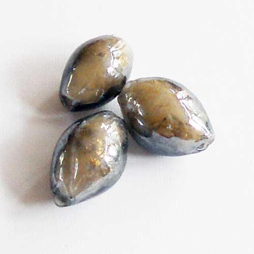 Handgemaakte ovaal gevormde lampworkkraal met een witte kern, vlokjes zilverfolie en een grijze buitenkant. Mooie glans.