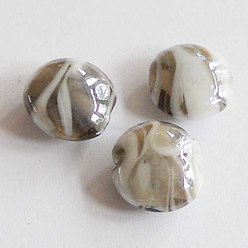 Handgemaakte plat ronde lampworkkraal met swirl in grijs-wit. Mooi glanzend.
