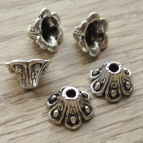 Kelkvormig kraalkapje in antiek zilverkleur.
