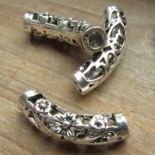 Metalen buisjeskraal, opengewerkt en iets gebogen. Met op de voorzijde bloemetjes. In deze kraal kun je meerdere koorden, bijvoorbeeld waxkoord, rijgen. Gekleurde koorden geven ook een leuk effect, omdat de kraal open is. Je ziet de kleuren dus ook aan de buitenkant!