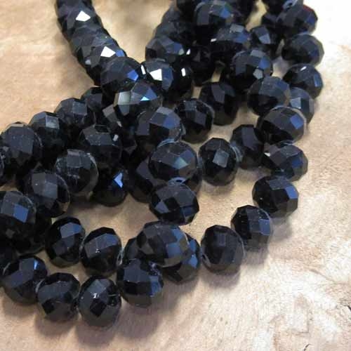 Semi-ronde glaskraal met facetten. Deze zwarte glaskralen doen het goed op vele manieren. Allemaal dezelfde kralen tot een ketting geregen is zeer klassiek. Gecombineerd met andere kralen kan het juist weer heel trendy zijn.