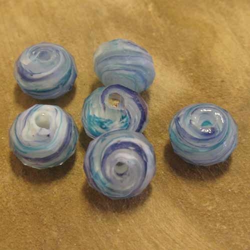 Lampwork rondelle gemêleerd blauwDeze glaskraal met facetten heeft een mooie 'swirl' van een aantal blauwtinten. De term swirl slaat op het draaiende effect van de kleuren. Handgemaakt, dus er is niet één kraal hetzelfde.