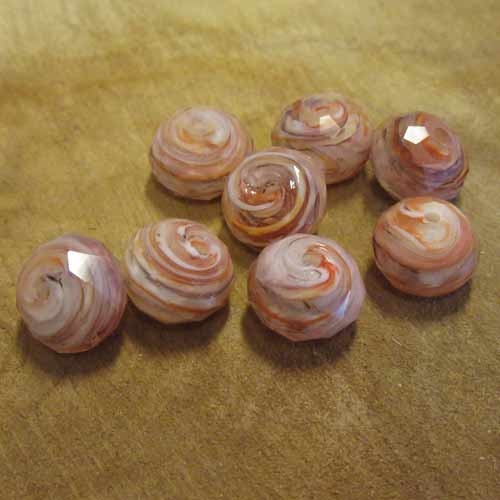 Glaskraal gemaakt met de lampwork techniek. Semi ronde kraal met facetten. De bruintinten zitten mooi gedraaid rond het rijggat. Handgemaakt, dus elke kraal is uniek.