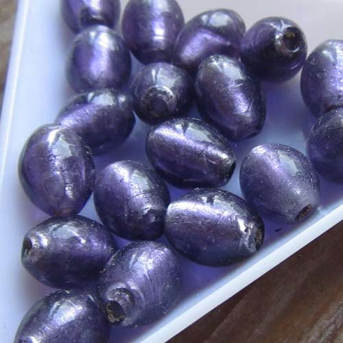 Glaskraal ovaal. Rond de kern van de kraal zit een laagje zilverfolie, waardoor de kraal een mooie glans krijgt.