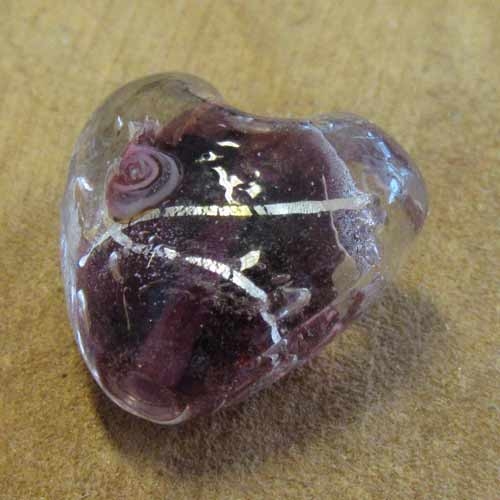 Handgemaakte lampwork glaskraal in de vorm van een hart. De kern van de kraal is aubergine kleurig, met een rozerode bloem erop en sliertjes zilverfolie ter decoratie. De rest van de kraal is transparant.