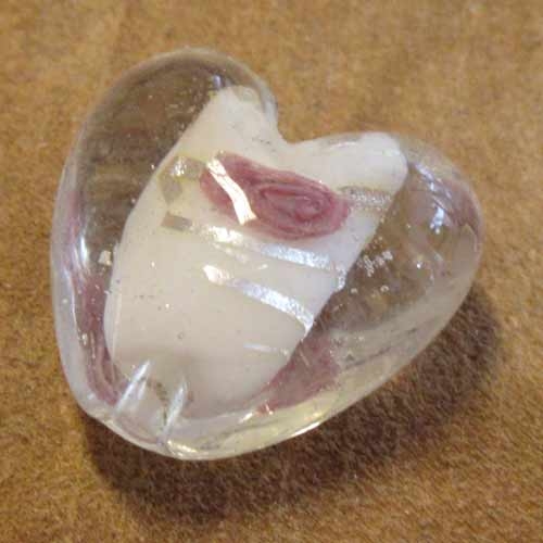 Hartvormige glaskraal met zilverfolie en bloem.