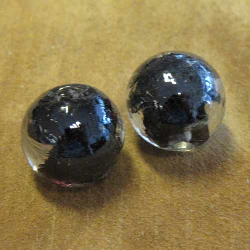 Handgemaakte glaskraal met zwarte kern met swirl en transparante laag erom heen.