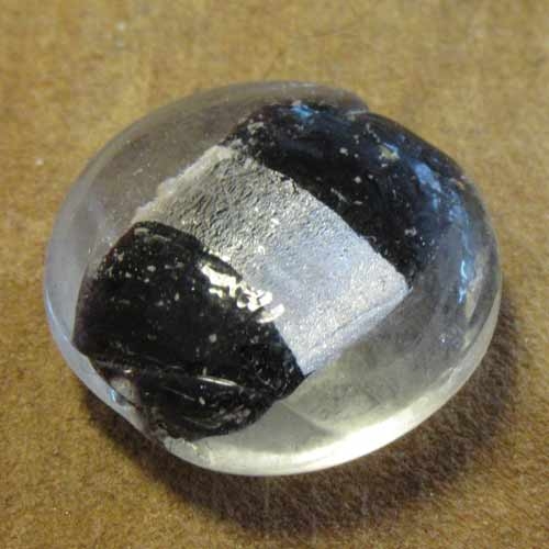 Handgemaakte glaskraal plat rond met zwarte kern met zilverfolie erover heen. Met transparante laag erom heen.