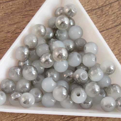 Glaskraal grijs met plating: speelse touchOok dit glaskraaltje heeft van verschillende kanten een andere aanblik. De ene kant is grijs, de andere kant heeft een donkerder wat zilverkleurige plating met glans. Het is daarmee een two-tone kraal, met twee tinten. Dit geeft een speelse draai aan je sieraden.