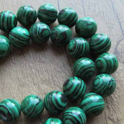Streng synthetisch malachietDeze kralen moet je kopen voor de uitstraling, niet als je op zoek bent naar natuursteen met helende werking. Deze malachiet is namelijk synthetisch gemaakt. De kralen zien er prachtig uit, met een mooie gemèleerde look. En natuurlijk veel voordeliger dan de 'echte'. Een leuke kraal om je trendy sieraden mee af te maken!