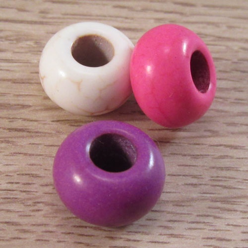 Groot gat kraal paarsRondelle, imitatie turquoise. Gladde paarse kraal met de look van turquoise. Door de grote rijgopening ook voor dik koord te gebruiken.