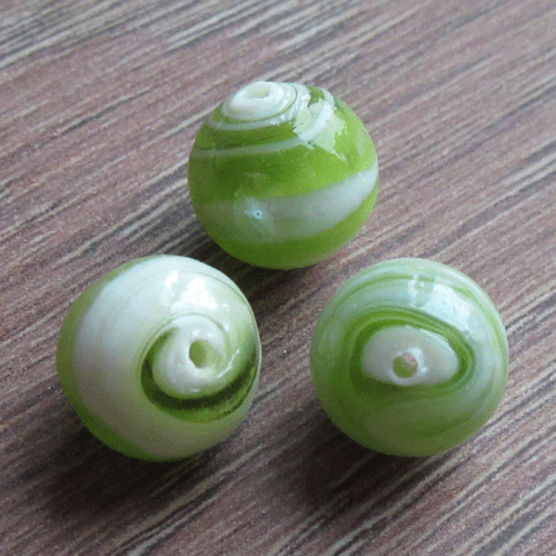 Ronde glaskraal in wit met groen en glans erop.