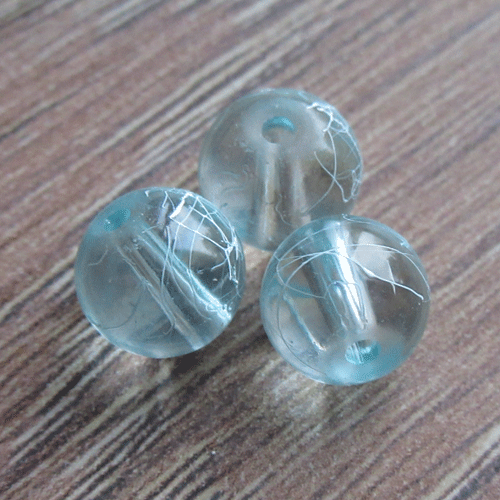 Ronde glaskraal, transparant met wit lijnenspel erop..