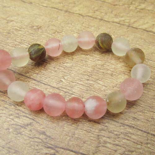 Streng watermelon 6 mmNatuursteen kraal in semi-transparante, frosted uitvoering. De kleur varieert van licht naar zachtroze, rozerood en bruin.