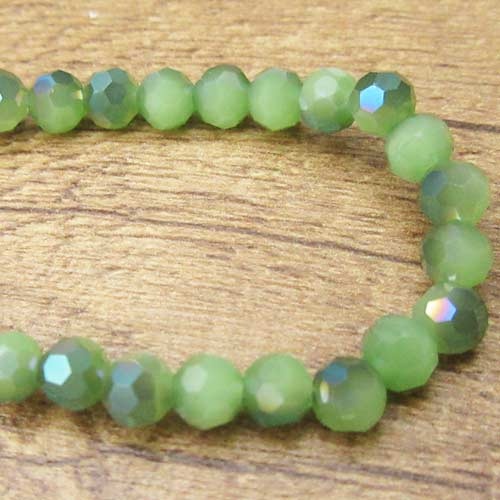 Streng glaskralen 4 mm facet met AB platingLeuk glaskraaltje met deels een plating eroverheen in een iets donkere tint groen met glans. Daardoor krijgt deze kraal, doordat bij het rijgen dan de ene, dan de andere kant van de kraal boven ligt, een speelse, afwisselende look.