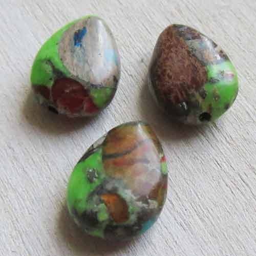 Druppeltje, glad, multicolor. De kleuren variëren van groen, blauw, beige, rood, bruin en soms een vleugje oranje.
