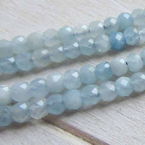 Aquamarijn in een bleekblauwe tint. Deze kraal heeft een glasachtige uitstraling en is mooi gemêleerd. Geeft een zachte uitstraling aan je sieraden.