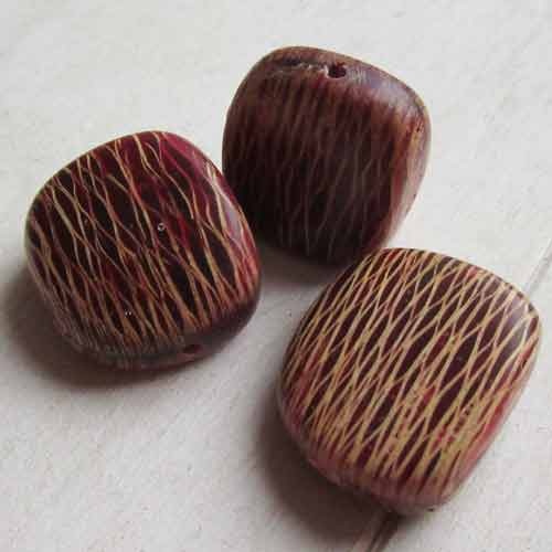 Kralen van papayablad met kunsthars coating, waardoor ze deze zeer aparte look krijgen. De kraal is bordeaux-rood met fijne goudkleurige draden erover.