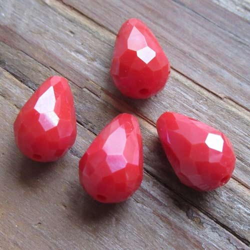 Rode druppelkraal, imitatie jade. Deze kraal is in helderrood uitgevoerd en heeft een mooie fonkelende AB-glanslaag.