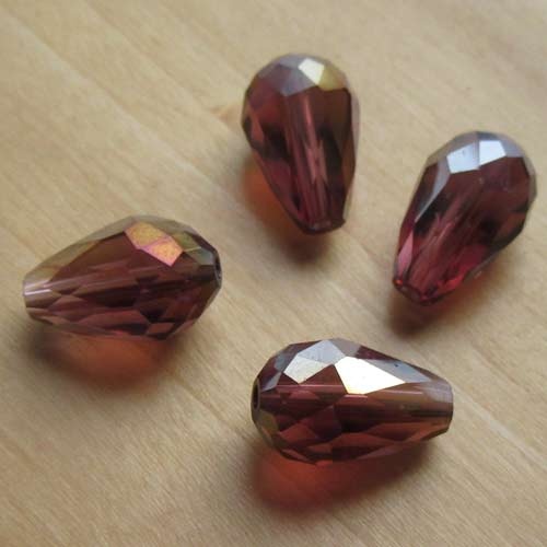 Transparante druppelkraal in paarstint. De kraal heeft een beetje olie-achtige electroplating die een mooie glans geeft aan de kraal.