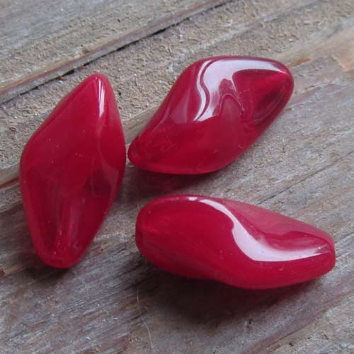 Mooie gladde glaskraal met iets twist (iets gedraaid). Semi-transparant met opaal uitstraling.• Maat: 21 x12 mm, rijggat: 1 mm.• Per stuk.• Materiaal: glas.• Kleur: rood.