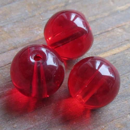 Mooie gladde ronde glaskraal. Transparant.• Maat: 10 mm, rijggat: 1 mm.• Per stuk.• Materiaal: glas.• Kleur: rood.