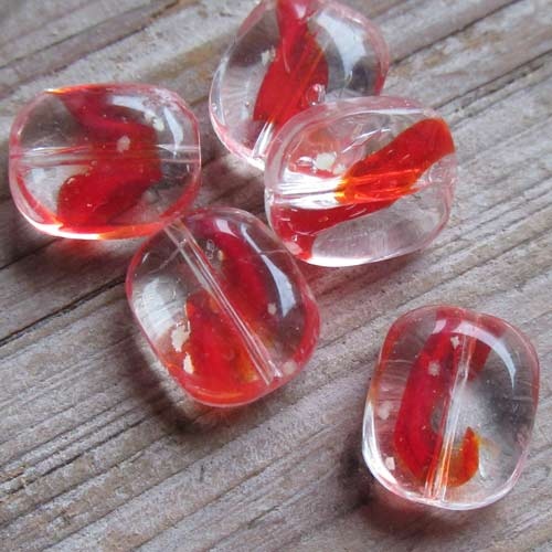 Dit kraaltje doet me een beetje denken aan de knikkers van vroeger en ik word er elke keer weer vrolijk van!• Maat: 12 x 10 x 5 mm, rijggat: krap 1 mm.• Per stuk.• Materiaal: glas.• Kleur: rood, helder transparant.