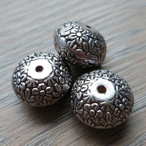 Antiek zilverkleurige grote kraal, afgeplat met bloempatroon rondom.