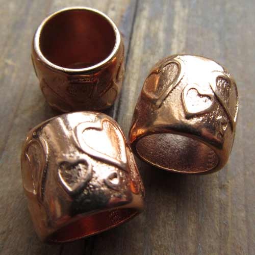 Rosëgouden kraal met patroon van hartjes in reliëf.