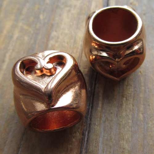 Rosëgouden kraal met in relIef aan twee kanten van een groot hart. Beetje zegelring-achtig