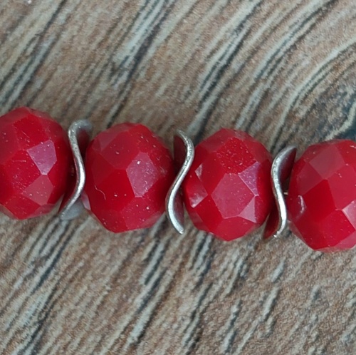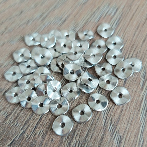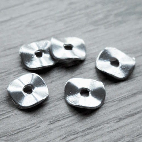 Lekker veel kralen tegelijk zitten er in dit zakje met metalen spacers. Het is een elegant, ietwat golvend model. Staat leuk tussen kralen van 6 tot en met 10 mm. Zie voorbeeld met rondellen 6 x 8 mm op de tweede foto. Extra leuk in kindersieraden! En voor de prijs hoef je het niet te laten: dit leuke tussenkraaltje kost maar € 0,03 per stuk!