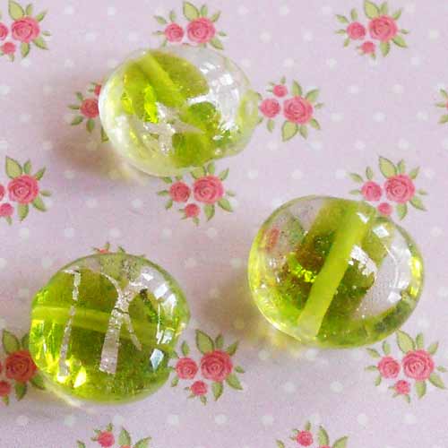 Lampwork glaskraal in plat ronde vorm met rond de kern sliertjes zilverfolie verwerkt. De kraal is transparan en rond de kern van de kraal in een fris groene tint.