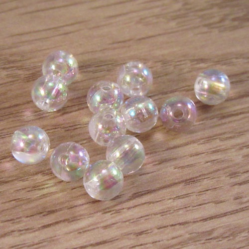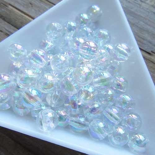 Glanskraaltje 6 mm transparantKunststof kraaltje met mooie glans, een beetje zoals een bel van bellen blazen. Geeft een mooi effect in sieraden, ook handig te combineren natuurlijk zo'n transparant neutraal kraaltje.