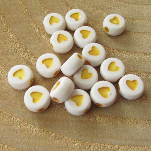 Deze leuke plat ronde kralen met ster combineren perfect met onze plat ronde letterkralen. Ook leuk met rocailles. Witte kraal met gouden hartje.