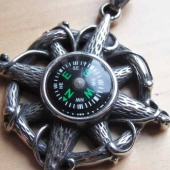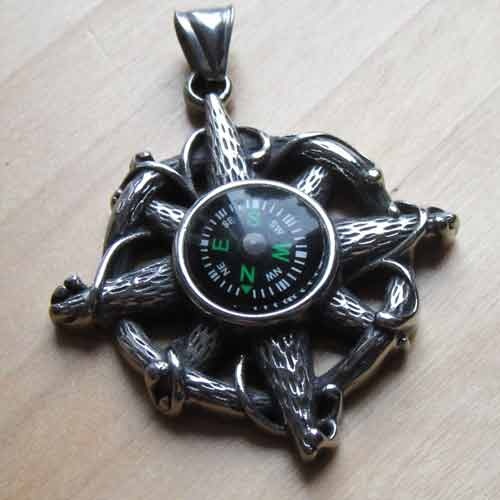 Stoere hanger in donker antiek zilverkleur, met draaiend kompas in het midden.