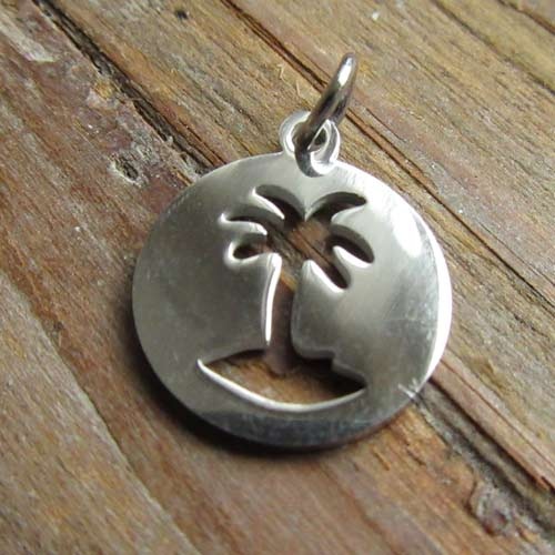 Zilverkleurige bedel, lasercut. Beide kanten zijn hetzelfde, alleen staade palmboom precies andersom.