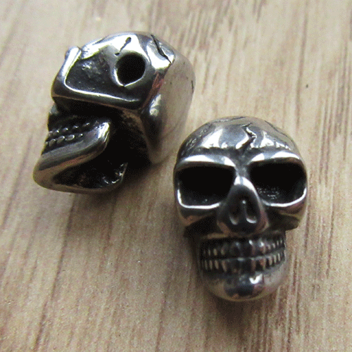 Stoere, gladde titanium kraal in de vorm van een schedel. Beetje donkere, gunmetal-achtige kleur. Het gat gaat dwars door de schedel heen, ideaal dus voor armbanden.