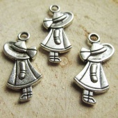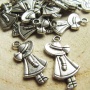 Hangertje van metaal van een meisjesfiguur in ouderwetse kleding. Lief bedeltje om aan een bedelarmbandje te doen.