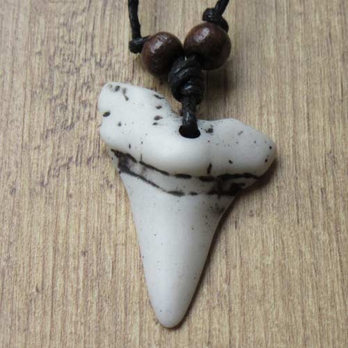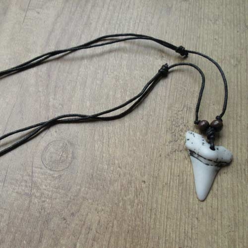Zwarte verstelbare ketting met net boven de hanger twee houten kralen. De hanger is een iets kleinere haaientand in off-white met wat zwarte details erop,