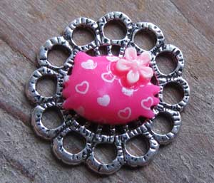 Poezenkopje met hartjesprint in pink. Leuk als oorbelletjes. De achterkant van deze cabochon is helemaal vlak.