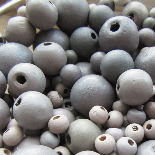 Mix van houten kralen in grijs en taupetinten.