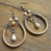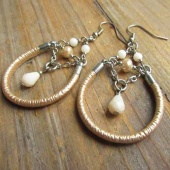 Hier is gestikt imitatieleer gebruikt om de loops te maken. Gecombineerd met kralen van glas en schelp en stukjes schakelketting is er een elegante, vrouwelijke oorbel gecreëerd.