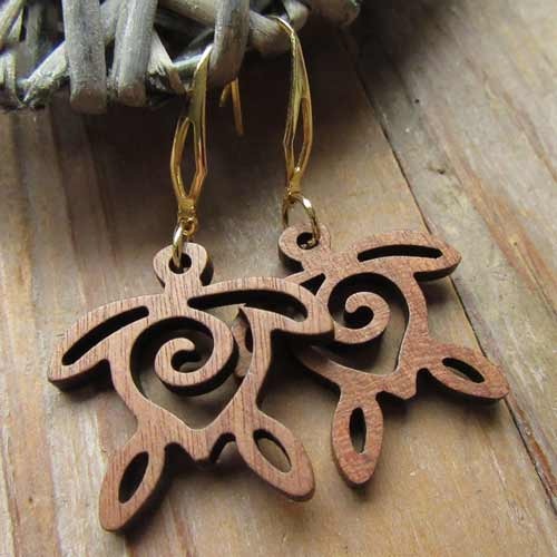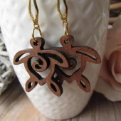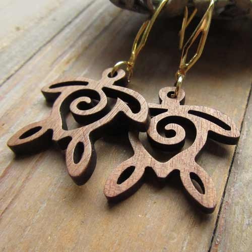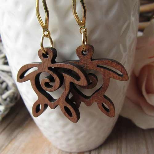 • Lengte: (vanaf de bovenkant van het oorhaakje gemeten) 5 cm.• Goudkleurige RVS oorhakenOorbellen schildpadjesSchildpadjes van hout vormen de basis van deze oorbellen. Gemaakt van wat donkerder hout, opengewerkt met een spiraal in het midden. Afgewerkt met luxe RVS oorhaken in goudkleur.